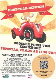 Seid dabei, wenn das Zweite Bobbycar – Rennen in Escherode stattfindet. Es sind alle Staufenberger*innen jeder Altersklasse herzlich dazu eingeladen sich spannende Rennen zu liefern!