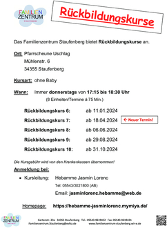 Das Familienzentrum Staufenberg freut sich in Zusammenarbeit mit Jasmin Lorenc, Hebamme, weitere Rückbildungskurse in der Pfarrscheune Uschlag, Mühlenstr. 6 anbieten zu können.