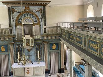 Klassizistisch auch das Innere von St. Petrus: Mit den vielen Säulen habe der Kirchenraum etwas von einem Tempel, sagt Pastor Meier, und ist sogar teilweise tapeziert. Die Sakraltapeten mit Ornamenten in französischem Stil stammen vermutlich aus der Tapetenmanufaktur I.C. Arnold, Kassel, handgedruckt auf hochwertigem Papier und mit Illusionsmalerei versehen durch den Mündener Maler und Zeichenlehrer Kellermann. Da muss man mitunter schon sehr genau hinsehen, um zu erkennen, dass es sich um zweidimensionale Bilder und nicht um Reliefs handelt.