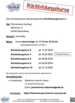 Das Familienzentrum Staufenberg freut sich in Zusammenarbeit mit Jasmin Lorenc, Hebamme, weitere Rückbildungskurse in der Pfarrscheune Uschlag, Mühlenstr. 6 anbieten zu können.