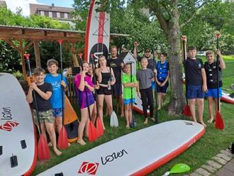 Am 06.08 machten wir uns mit 11 Jugendlichen auf den Weg zur Fulle – Marie in Fuldabrück. Hier erhielten wir die Stand – Up – Paddle Boards und begaben uns zur Fulda. Als alle den Aufstieg auf die Board geschafft hatten, fuhren wir langsam entgegen der Strömung. Nachdem viele die Wassertemperatur der Fulda ausgetestet hatten, schafften wir eine gute Strecke, bis wir uns entschieden umzukehren. Uns half auf dem Rückweg zur Fulle - Marie die Strömung der Fulda, was erfreulich war, nachdem der Hinweg doch einiges an Kraft gekostet hat. Manche legten sich auf dem Board ab oder versuchten sich an kleinen Yoga – Einheiten auf dem Board. Bei der Rückkehr an die Fulle – Marie waren alle platt. Wir räumten die Boards, Paddel und Finnen auf und die Jugendlichen wurden mit Keksen und Gummibärchen für die Tour belohnt.