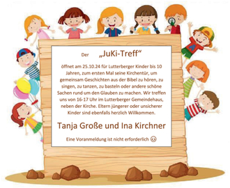 JuKi, Abkürzung für „Junge Kirche“, möchte m. Bibelgeschichten, Liedern & vielseitigen Kreativangeboten, Kindern den christlichen Glauben näherbringen. Die teilnehmenden Kinder sollen erleben, wie gut es sich anfühlt, Gemeinschaft zu erleben. Der Glaube an sich selbst & an das eigene Können &Handeln, steht dabei im Vordergrund.