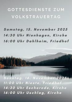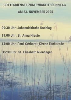 | 11:00 Uhr | Gottesdienst in der Friedhofskapelle in Nieste |