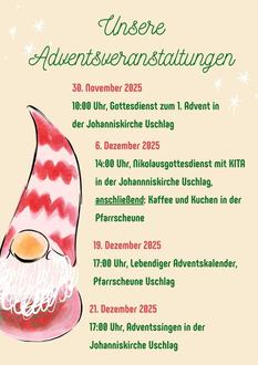 | 14:00 Uhr | Nikolausgottesdienst mit KITA in der Johanniskirche Uschlag, anschließend Kaffee und Kuchen in der Pfarrscheune Uschlag |