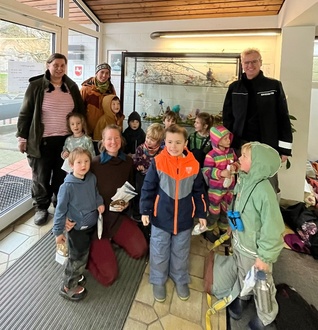 Bürgermeister Bernd Grebenstein hat sich darüber sehr gefreut, dass er uns als Dankeschön Nikolaustütchen und Goldstücke geschenkt hat. Dann haben wir noch ein Foto gemacht: die Vitrine, der Bürgermeister und wir, die Schmetterlingsbande aus dem Waldkindergarten Escherode.