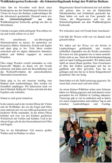 Wir haben auf der Wiese vor der Kirche in Landwehrhagen gefrühstückt und wurden schließlich eingeladen uns die Kirche anzusehen. Da waren wir sehr gespannt wie es innen aussieht. Schön sieht es aus. Nach der Kirchenbesichtigung sind wir nach Uschlag gewandert. Wir haben noch Äpfel an einem Baum gesehen. Eine Erwachsene ist über den Graben gesprungen und hat sie gepflückt und rüber geworfen, Eine hat sie gefangen und eine hat sie in ihrem Kängurubeutel gesammelt. Das war lustig.