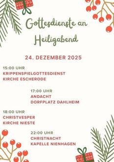 | 17:00 Uhr | Heiligabendandacht in Dahlheim auf dem Dorfplatz |