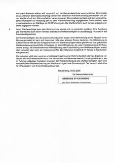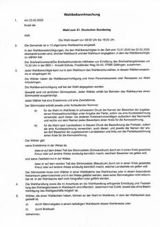 Die öffentliche Bekanntmachung über die Wahl zum 21. Deutschen Bundestag am 23.02.2025 (Wahlbekanntmachung) wurde im Amtsblatt für den Landkreis Göttingen Nr. 06 vom 06.02.2025 ab Seite 124 veröffentlicht. Die Bekanntmachung ist in dieser Ausgabe des Mitteilungsblattes ebenfalls abgedruckt.