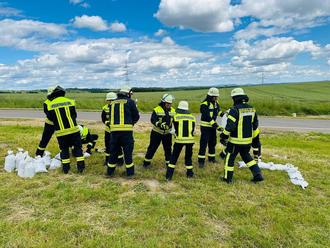 Eine letzte Übung forderte den Teilnehmern nochmal einiges ab. Aufgrund der immer mehr werdenden Unwetterlagen mussten Sandsäcke gefüllt, transportiert und aufgestapelt werden.