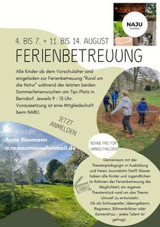Die NAJU Twistetal bietet in den letzten beiden Wochen der Sommerferien eine Ferienbetreuung für Kinder ab dem Vorschulalter an. Unter dem Motto „Rund um die Natur“ wird es an den Vormittagen vom 4. bis 7. August sowie vom 11. bis 14. August verschiedene Angebote geben. Treffpunkt wird am Tipi-Platz in Berndorf sein.