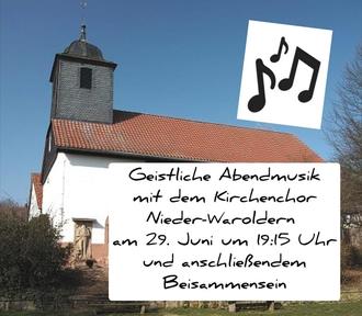 | 19:15 Uhr | Gottesdienst in Nieder-Waroldern mit dem Kirchenchor und anschließendem Beisammensein. |