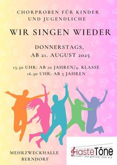 Ab Donnerstag, den 21. August, heißt es wieder: Stimmen warm machen und gemeinsam singen! Unser Kinderchor von Haste Töne e.V. trifft sich wöchentlich in zwei Gruppen zum fröhlichen Proben in der Mehrzweckhalle Berndorf (Erdgeschoss).