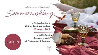 | 16.00 Uhr | Sommerausklang -Gottesdienst mal anders- in Gembeck, Kirche, anschließend Beisammensein mit Prosecco und Canapés |