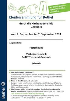 Im traditionellen Diakonie-Monat September führen wir auch die Kleidersammlung für Bethel durch. In Berndorf, Helmscheid und Gembeck findet sie diesmal vom 02. bis 07. September 2024 statt. In Mühlhausen befindet sich keine Sammelstelle. Bringen Sie die Kleiderspende bitte in die benachbarten Orte. Handzettel mit weiteren Informationen, was gesammelt wird, liegen rechtzeitig in unseren Kirchen, in den KiTa´s, im Gemeindehaus Berndorf und im REWE Berndorf aus.
