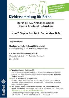 Im traditionellen Diakonie-Monat September führen wir auch die Kleidersammlung für Bethel durch. In Berndorf, Helmscheid und Gembeck findet sie diesmal vom 02. bis 07. September 2024 statt. In Mühlhausen befindet sich keine Sammelstelle. Bringen Sie die Kleiderspende bitte in die benachbarten Orte. Handzettel mit weiteren Informationen, was gesammelt wird, liegen rechtzeitig in unseren Kirchen, in den KiTa´s, im Gemeindehaus Berndorf und im REWE Berndorf aus.