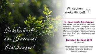 | 9.00 Uhr | Arbeitseinsatz am Ehrenmal vor der St. Georgskirche in Mühlhausen. |