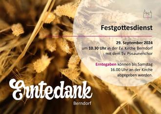 | 10.30 Uhr | Erntedank - Gottesdienst in Berndorf mit Posaunenchor, Kirche, (Lektorin Graß) |