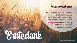 14.00 Uhr | Erntedank - Gottesdienst in Helmscheid, Kirche, (Pfrin. Schuppe Naumann) anschl. Beisammensein mit Kaffee und Kuchen und Bücherflohmarkt in der Dorfmitte |