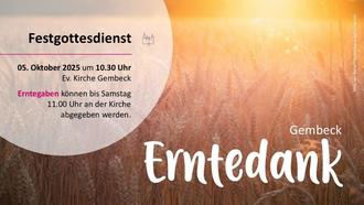 | 10.30 Uhr | Festgottesdienst Erntedank in Gembeck, Kirche (Pfrin. Lehmann) |