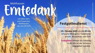 | 11.30 Uhr | Festgottesdienst Erntedank mit MGV 1875 und Frauenchor Mühlhausen in der Scheune Meergans (Hexenecke 6), Mühlhausen, (Pfrin. Lehmann), anschließend Beisammensein mit Würstchen vom Grill |
