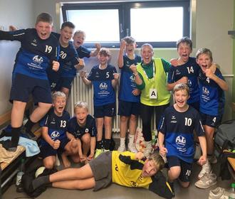 Angefangen mit dem 1:0 durch David und einem starken gehaltenen 7-Meter durch unseren Torhüter Lasse, der nach dem Spiel von all seinen Mitspielern kräftig für seine bärenstarke Leistung gefeiert wurde, konnten die Jungs gut ins Spiel finden. Unser Spielführer Lennard A. auf der Mitte und Kai auf der Halbposition nutzten endlich ihre Lücken und verwandelten ihre freien Würfe gezielt im gegnerischen Tor. Bis zur Halbzeit verlief das Spiel auf Augenhöhe. Wir konnten uns zwar zwischenzeitlich mit vier Toren absetzen, doch bekamen wir zwei Spieler der gegnerischen Mannschaft (je 10 und 7 Tore) über das ganze Spiel nicht vollständig in den Griff.