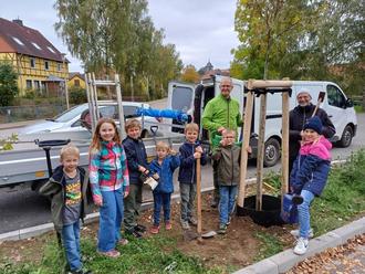 Holger Keuling pflanzte unter Mithilfe der Kindergottes-dienstkinder noch 2 Bäume als Teil der Neugestaltung des Festplatzes.