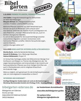 Bei der Kirche am See kann man den Bibelgarten mit allen Sinnen jeden Tag besuchen und das Paradies erleben. Oder Sie kommen zu den kostenlosen Seminaren im Zentrum „Kirche unterwegs“ - Halbinsel Scheid, Adamsfeld 35, 34513 Waldeck. Die Seminarzeiten sind von 9:30 – 17:00 Uhr. Weitere Informationen unter www.ekkw.de/bibelgarten-guides und bibelgarten.bgkw@ekkw.de.