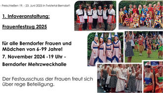 Das Freischießen 2025 in Twistetal-Berndorf findet im kommenden Jahr vom 19. - 23. Juni 2025 statt. Der Festausschuss des Frauenfestzuges lädt alle interessierten Berndorfer Frauen und Mädchen zum Infoabend in die Mehrzweckhalle Berndorf am 7.11.2024 um 19 Uhr ein. An diesem Abend wird das Konzept für den Montagsumzug am 23. Juni 2025 vorgestellt. Interessierte Frauen und Mädchen von 6 - 99 Jahre können sich an diesem Abend in die Listen der jeweiligen Gruppen eintragen.