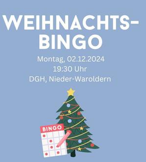 wir laden herzlich ein zur Weihnachtsfeier mit "Weihnachtsbingo" am Montag, den 02. Dezember 2024, um 19:30 Uhr im Dorfgemeinschaftshaus in Nieder-Waroldern. Freut euch auf einen stimmungsvollen Abend mit netten Gesprächen, weihnachtlichen Köstlichkeiten und einer gemütlichen Runde Bingo.