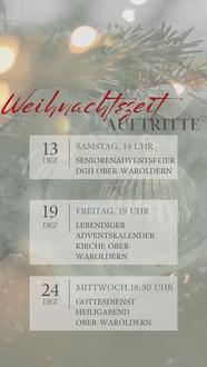 Der Musikverein Ober-Waroldern wird auch in diesem Jahr wieder mit stimmungsvoller Blasmusik zur Advents- und Weihnachtszeit beitragen. Zu verschiedenen Anlässen erklingen traditionelle und moderne Weihnachtsmeldodien.
