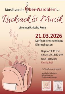 Unter dem Motto „Rucksack und Musik“ lädt der Musikverein Ober-Waroldern zu einem besonderen Frühjahrskonzert ein. Die Veranstaltung findet am Samstag, 21. März 2026, im Dorfgemeinschaftshaus Twistetal-Elleringhausen statt. Beginn ist um 19:30 Uhr, Einlass ab 18:30 Uhr.
