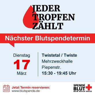 Der nächste Blutspendetermin findet am Dienstag, 17. März von 15:30 bis 19:45 Uhr in der Mehrzweckhalle in Twiste statt.