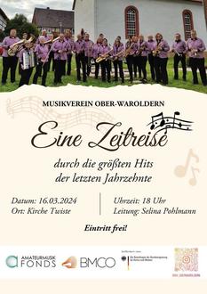 Am 16. März um 18.00 Uhr veranstaltet der Musikverein Ober-Waroldern in der Twister Kirche ein Konzert unter dem Motto „Eine Zeitreise durch die größten Hits der letzten Jahrzehnte“.