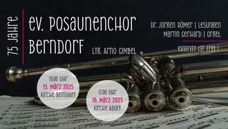 | 19.00 Uhr | Jubiläumskonzert 75 Jahre ev. Posaunenchor Berndorf, Ltg. Arno Gimbel, Kirche Berndorf |