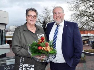 Bürgermeister Manfred Ludewig bedankte sich bei Regine Koch für „40 Jahre im öffentlichen Dienst – davon fast 32 Jahre für die Stadt Vellmar – heutzutage eine eher seltene Leistung, die Respekt und Dankbarkeit verdient. Bürgermeister Ludewig überreichte die Jubiläumsurkunde, Blumen und Präsent mit dem Wunsch, auch in den kommenden Jahren weiterhin vertrauensvoll zusammenzuarbeiten.