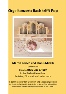 In der ev. Kirche Obervellmar spielen die beiden Organisten Martin Persch und Jannis Mizelli Werke von Bach über Filmmusik bis hin zur modernen Pop-Musik. Das Spektrum ist somit - im Gegensatz zum Gottesdienst - breit gefächert und es erklingt die Orgel mit Musik, die man in einer Kirche nicht erwartet. Martin Persch und Jannis Mizelli haben auch noch die ein oder andere Überraschung vorbereitet.