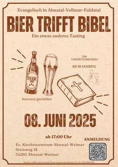 Am Sonntag, den 08. Juni 2025, lädt der Kooperationsraum Ahnatal-Vellmar-Fuldatal junge Erwachsene zu einem besonderen Abend ein: Unter dem Titel „Bier trifft Bibel“ erwartet die Teilnehmenden ab 17.00 Uhr im Evangelischen Kirchenzentrum Ahnatal-Weimar (Steinweg 18, 34292 Ahnatal-Weimar) eine genussvolle Kombination aus Bierverkostung und biblischen Texten.