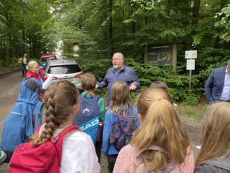 Bürgermeister Manfred Ludewig begrüßte am Waldparkplatz Schäferberg die Schülerinnen und Schüler der Grundschule Frommershausen.