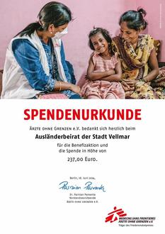 Im Rahmen der „Internationalen Woche“ 2023 sammelte der Ausländerbeirat Vellmar 237,00 € an Spenden. Dieser Betrag wurde nun an die Organisation „Ärzte ohne Grenzen e.V.“ überwiesen.