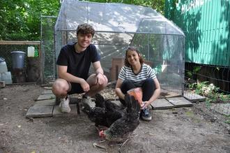 Luca und Julia Schampier von der Stadtjugendarbeit Vellmar vor dem neuen "gesicherten" Stall mit dem Hühnerquartett