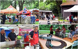Auch die Stände rund um die Festwiese boten jede Menge Action: Besonders gefragt war die Hüpfburg der Jugendfeuerwehr Stadt Vellmar, die mit ihrer imposanten Erscheinung nicht nur optisch ein Highlight war. Am Stand der Energie2000 wurde es dann sportlich-technisch: Auf der Carrera-Rennbahn mussten die Rennautos erst einmal mit reiner Muskelkraft – also durch kräftiges Radeln – auf Touren gebracht werden. Nur nicht übertreiben, sonst landete das Miniaturfahrzeug schneller im Rasen als im Ziel!