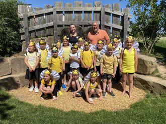 Kita-Leiterin Ann-Kathrin Brückmann und Bürgermeister Manfred Ludewig mit den "Vorschulis", die zu Eröffnung das Bienenlied sangen.