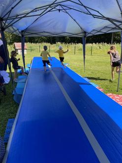 Neben Kinderschminken, Schubkarrenrennen und Wassertransport konnten die Kinder auch auf der großen „Airtrack“-Matte ihre Schnelligkeit unter Beweis stellen. Eröffnet wurde das Sommerfest von den „Vorschulis“ mit dem Bienenlied.