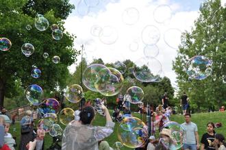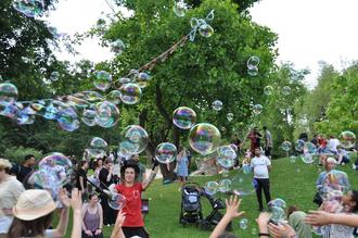 Die Kinder waren begeistert von den großen und kleinen Seifenblasen, die Paloma von Bubble-Zauber über die Wiese fliegen ließ.