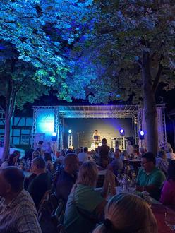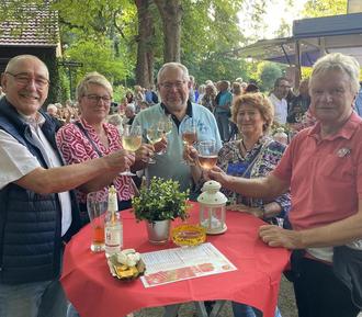 Rund 400 Gäste genossen bei angenehmen Temperaturen zwei lauschige Sommerabende im Park. Erster Stadtrat Hans-Georg Trust begrüßte die Gäste im Kastanienhof und freute sich über den großen Zuspruch. Trust dankte in seiner Ansprache Uwe Kemper und Jan Bischoff vom Kuratorium für die Organisation. Kuratoriumsvorsitzender Uwe Kemper zeigte sich sichtlich erleichtert, dass das Wetter mitspielte. „So hatten wir es uns gewünscht und auch bestellt“, so Kemper abschließend. Eine vielfältige Auswahl an Weinen vom Winzer, Cocktails, Bier und Softdrinks passte hervorragend zum Ambiente des Kastanienhofs. Flammkuchen, Bratwurst, Pommes und Käsespieße rundeten das kulinarische Angebot ab, welches bei den Besuchern sehr gut ankam.
