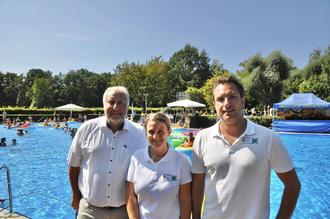 Dagmar Zinn, Betriebsleiterin der städtischen Bäder sowie ihr Stellvertreter Stefan Ebeling (rechts) hatten die Pool-Party geplant und organisiert.