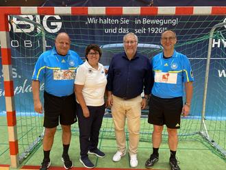 Im Tor: Schiedsrichter Frank Wenz, Jutta Ehrmann-Wolf (Leiterin DHB-Schiedsrichterwesen), Bürgermeister Manfred Ludewig und Ralf Damian (Schiedsrichter).
