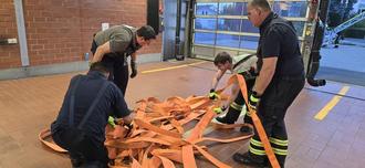 3. Station: Verknotete Schläuche sollten entwirrt und aufgerollt werden. Sobald eine Kupplung getrennt wurde, durfte diese nicht mehr losgelassen werden. Geschicklichkeit und Zusammenarbeit brachten in diesem Fall den Erfolg.