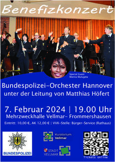 Zum 40. Mal ist das Bundespolizeiorchester Hannover unter der Leitung von Matthias Höfert zu Gast in Vellmar. Die Moderation übernimmt Dirk Hillebold, der wie in den vergangenen Jahren mit Witz und Charme kurzweilig durch das Programm führt.