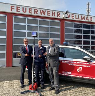 Im Rahmen der Feuerwehrförderung überreichte der Vorsitzende der „Sparkassenversicherung Kommunal“, Andreas Güttler, an Stadtbrandinspektor Thorsten Vogler ein neues LED-Beleuchtungssystem, das zur Erstausleuchtung von Einsatzstellen bei Nacht dient. Das mobile System hat einen Wert von rund 1.100 Euro und ist mit einem leistungsstarken Akku ausgestattet, der eine Betriebsdauer von bis zu 17 Stunden gewährleistet.